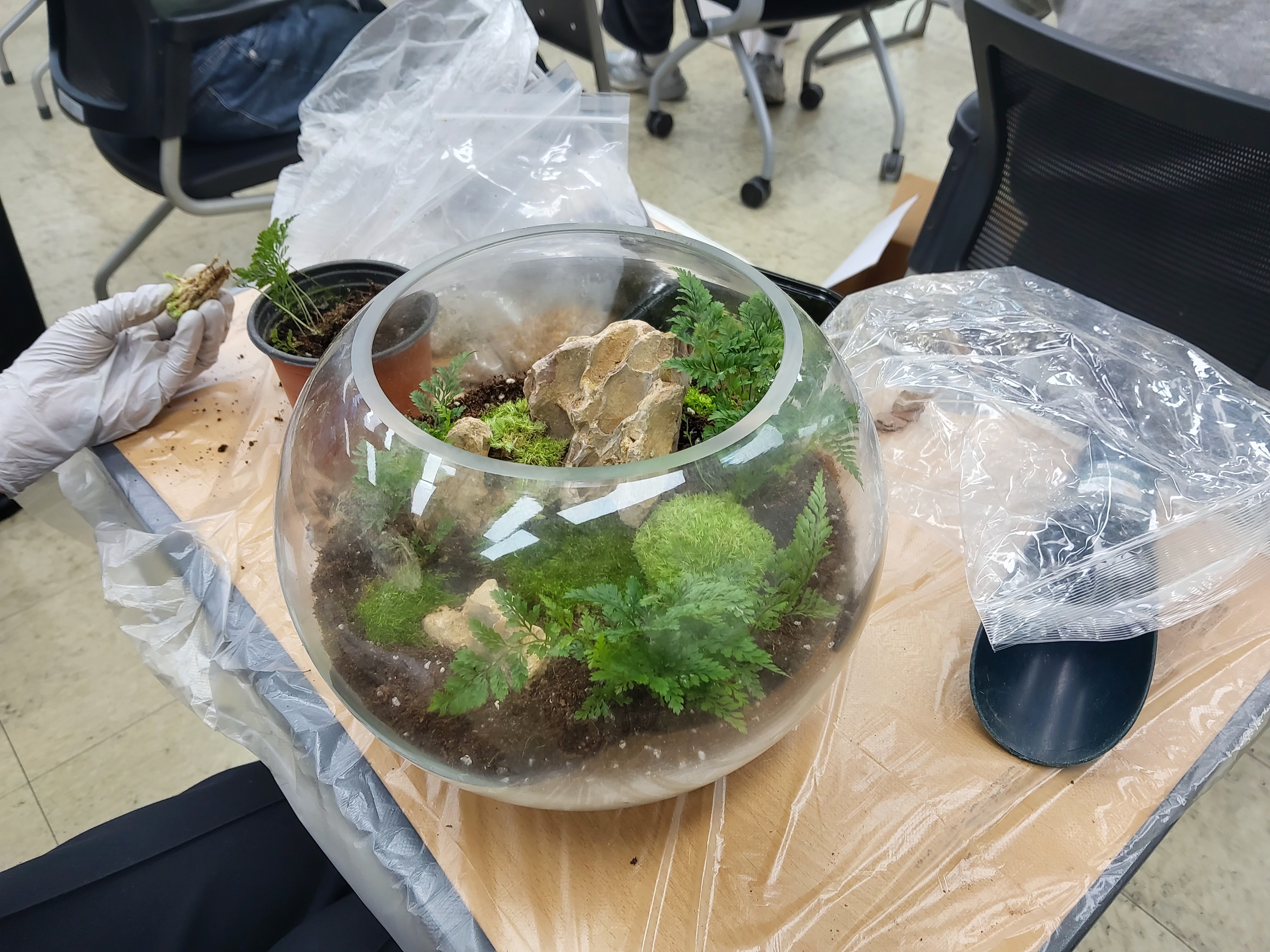 학생들은 각자 투명한 유리병에 자갈, 흙, 이끼를 차곡차곡 쌓으며 자신만의 미니 정원을 만들기 시작했습니다.