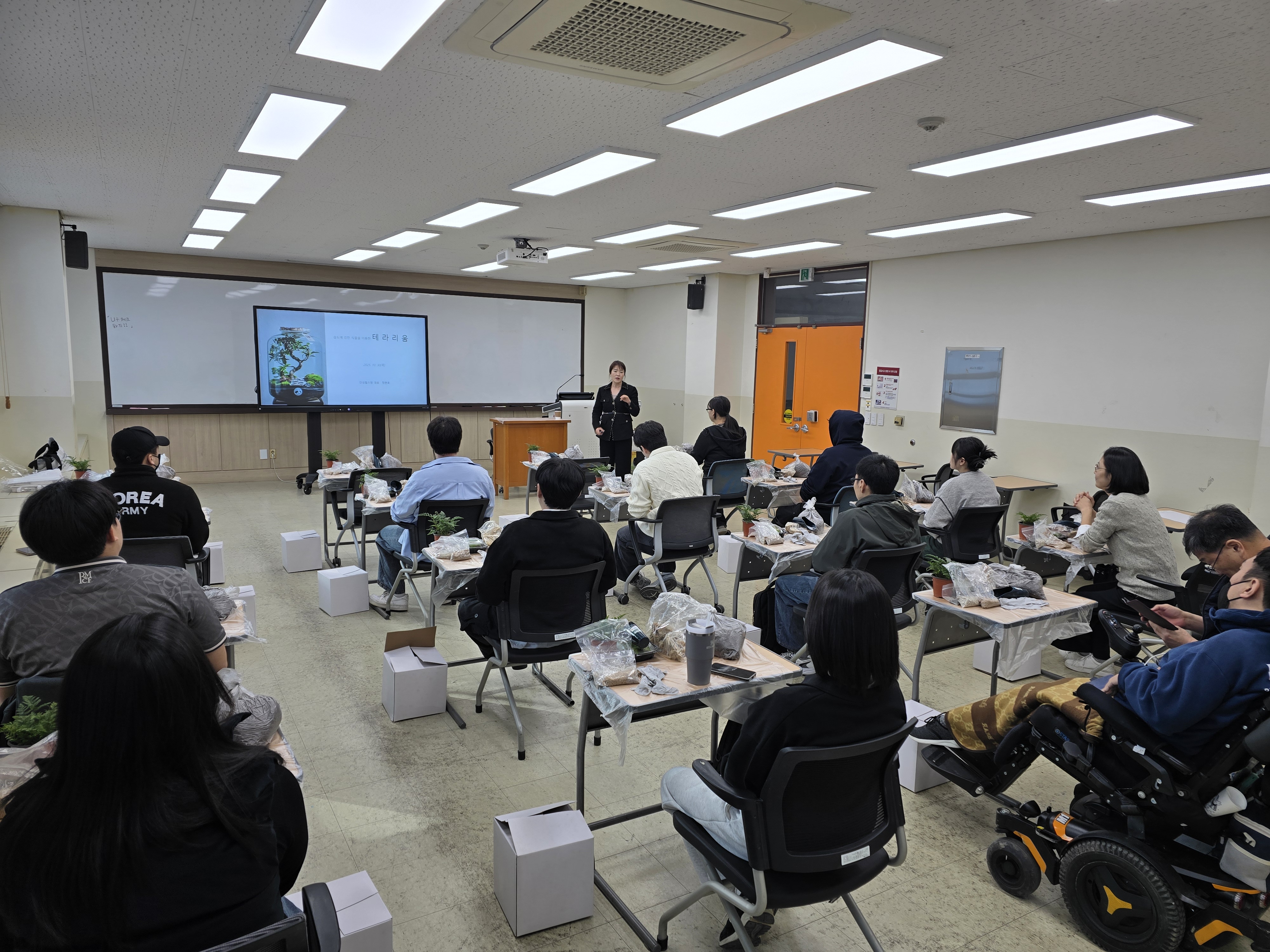 안녕하세요. 10월 30일(목), 한경국립대학교 사회복지학과에서는 안성힐스팜 정현호 대표님을 모시고 ‘습도에 강한 식물을 이용한 테라리움 특강’을 진행했습니다.