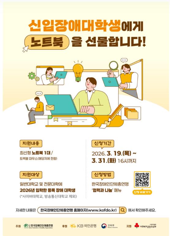 fnctId=bbs,fnctNo=358 단축 url 글번호 94436 2026 KB 신입 장애대학생 노트북 지원사업 안내 작성일 2026.03.31 수정일 2026.03.31 작성자 장애학생지원센터(본원) 조회수 378 첨부파일 (붙임)2026 KB 신입 장애대학생 노트북 지원사업 안내.hwp