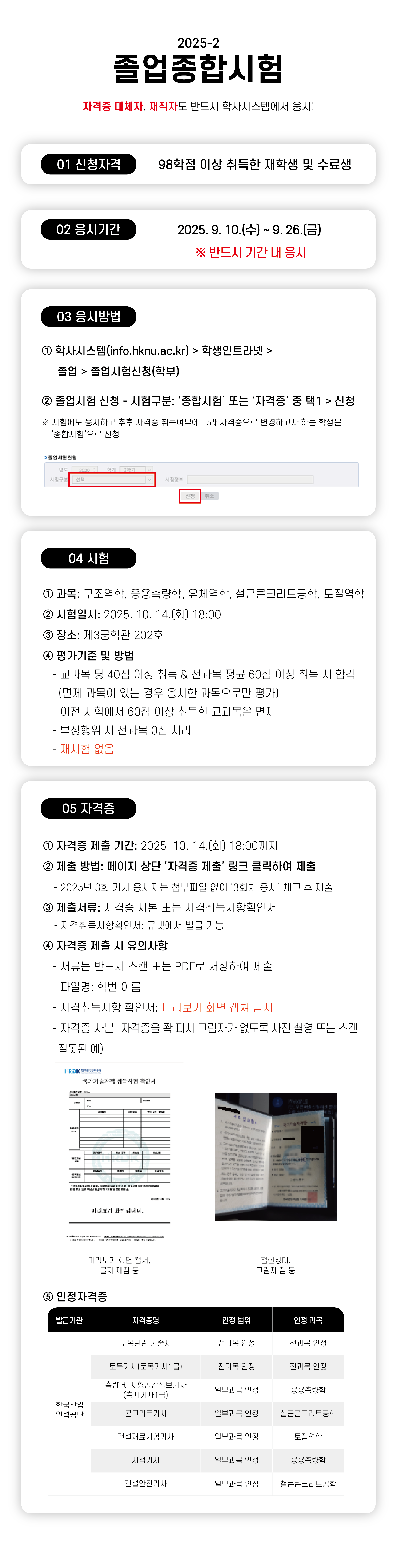 fnctId=bbs,fnctNo=236 단축 url 글번호 88566 [토목] 2025-2 졸업종합시험 안내 분류 토목 작성일 2025.09.10 수정일 2025.09.10 작성자 건설환경공학부 조회수 924 2025-2학기 졸업종합시험 안내입니다. 시험에 응시하고자 하는 학생은 기한내 신청 바랍니다. ★ 자격증 제출: https://naver.me/FkLrjNJ7 ★ 재직자 면제 안됨!!!!! ★ 자격증 대체자도 반드시 학사시스템에 응시!!!!! ※ 김운학 교수님 퇴직으로 구조역학 출제자 변경됨 첨부파일 2025-2 졸업종합시험 안내.pdf